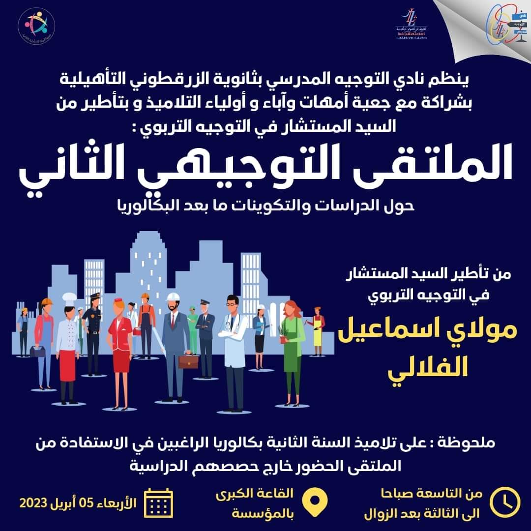 سينظم نادي التوجيه المدرسي بثانوية الزرقطوني التأهيلية بشراكة مع جمعية أمهات وآباء وأولياء التلاميذ وبتأطير من السيد مولاي إسماعيل الفلالي مستشار في التوجيه التربوي،الملتقى التوجيهي الثاني حول الدراسات والتكوينات ما بعد البكالوريا،وذلك يوم الأربعاء 05 أبريل 2023 بالقاعة الكبرى بالمؤسسة،إبتداء من الساعة تاسعة صباحا إلى الساعة الثالثة بعد الزوال.