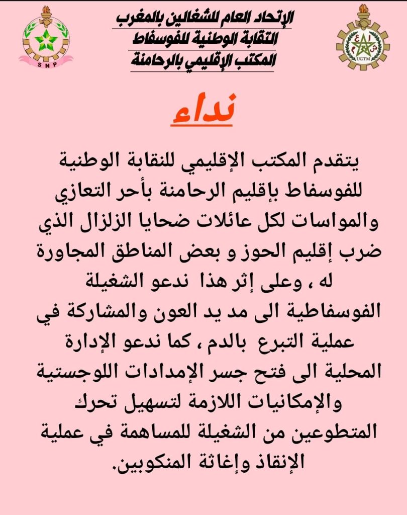 المكتب الإقليمي للشغيلة الفوسفاطية بالرحامنة يتوجه بهذا النداء صورةالمغرب بواسطة هيئة التحرير في 11 سبتمبر, 2023 0 شارك TwitterطباعةWhatsAppالبريد الإلكترونيFacebook احصل على تحديثات في الوقت الفعلي مباشرة على جهازك ، اشترك الآن. الاشتراك 0 شارك TwitterطباعةWhatsAppالبريد الإلكترونيFacebook