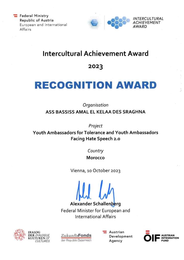 نالت جمعية بصيص أمل قلعة السراغنة جائزة تشجيعية في إطار “جائزة الإنجاز بين الثقافات” لهذه للسنة والتي تمنحها وزارة الفيدرالية النمساوية للشؤون الأوروبية والدولية.