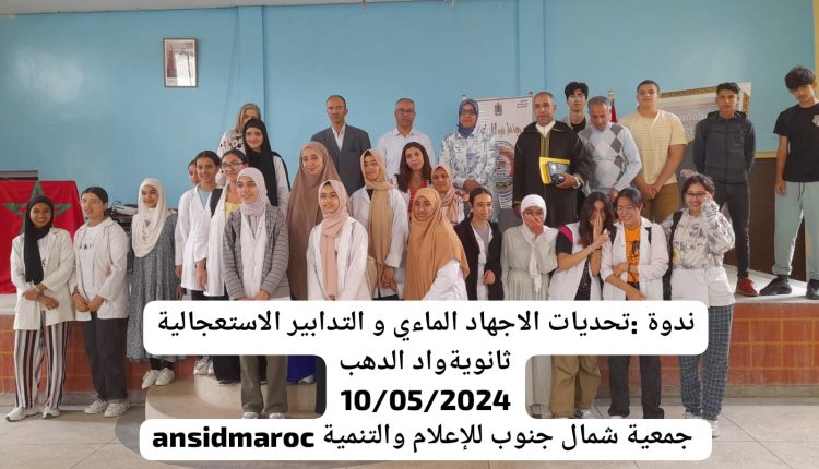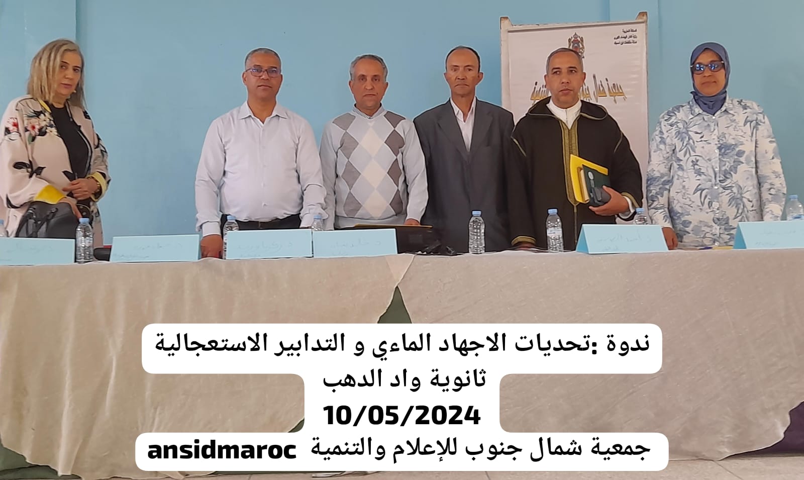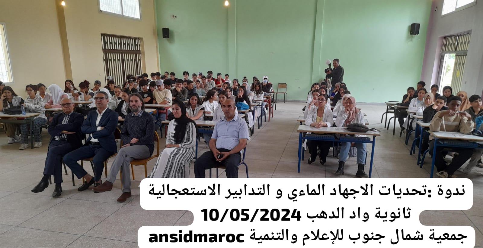 نظمت جمعية شمال جنوب للإعلام والتنمية بشركة مع المديرية الإقليمية للتربية الوطنية و التعليم الاولي و الرياضة ابن امسيك و بتنسيق مع المكتب الوطني للماء و الكهرباء و شركة ليدك ابن امسيك و المجلس العلمي المحلي ندوة علمية في موضوع” تحديات الاجهاد المائي و التدابير الاستعجالية“،بقاعة العروض بالثانوية التأهيلية واد الدهب بعمارة مقاطعات ابن امسيك.
