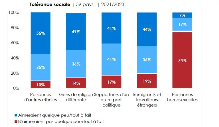 en queue de peloton en matière de tolérance vis-à-vis des différences sociales, tandis que l’Afrique Centrale et l’Afrique de l’Ouest se classent en tête de peloton.