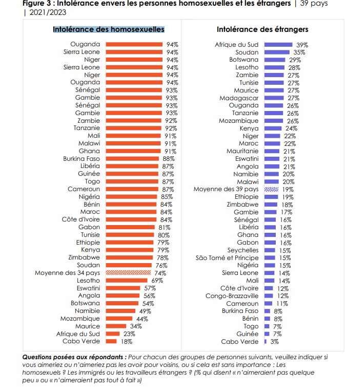 Une grande majorité d’Africains se montrent tolérants envers les personnes d’ethnies, de  religions, d’affiliations politiques et de nationalités différentes, mais seulement le quart parmi  eux se sentent à l’aise de vivre à côté d’une personne homosexuelle, révèle le dernier Profile  Panafricain d’Afrobarometer.