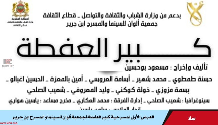 تستعد جمعية ألوان للسينما و المسرح ابن جرير، لعرض مسرحيتها “كبير العفطة” يومه الأحد 10 نونبر 2025، بالمركب الثقافي تابريكت سلا، انطلاقا من الساعة 20:00 مساءً.