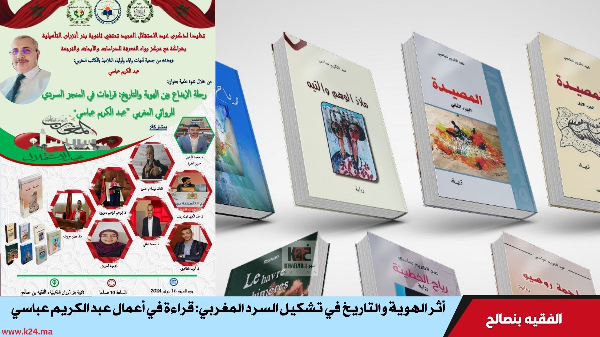 تعتزم ثانوية بئر انزران التأهيلية بالفقيه بنصالح، بالشراكة مع مركز رواء المعرفة للدراسات والأبحاث والترجمة، تنظيم ندوة علمية بعنوان: “رحلة الإبداع بين الهوية والتاريخ: قراءات في المنجز السردي للروائي المغربي عبد الكريم عباسي“، وذلك بمناسبة الاحتفال بعيد الاستقلال المجيد. ستنعقد الندوة يوم السبت 16 نونبر الجاري، ابتداءً من الساعة التاسعة صباحاً.
