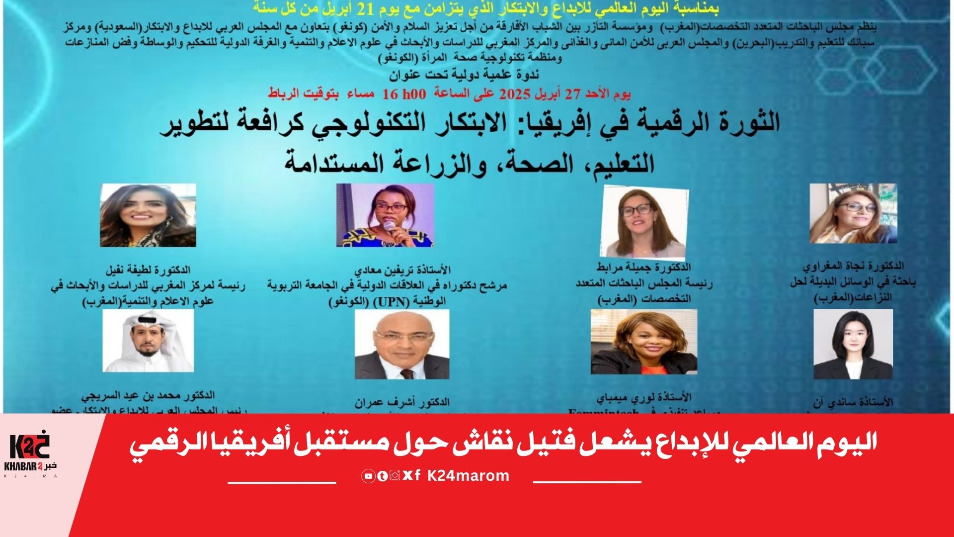 بمناسبة اليوم العالمي للإبداع والابتكار، الذي يوافق الحادي والعشرين من أبريل، يشهد العالم مبادرة هامة تجمع نخبة من الخبراء والأكاديميين والمهتمين بالشأن الأفريقي والعالمي. ينظم مجلس الباحثات المتعدد التخصصات (المغرب) ومؤسسة التآزر بين الشباب الأفارقة من أجل تعزيز السلام والأمن (الكونغو) بالتعاون مع عدة جهات إقليمية ودولية بارزة، ندوة علمية دولية تحت عنوان “الثورة الرقمية في إفريقيا: الابتكار التكنولوجي كرافعة لتطوير التعليم، الصحة، والزراعة المستدامة”.