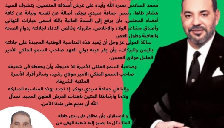 تهنئة من السيد هشام طاها، رئيس جماعة سيدي بوبكر، بمناسبة الذكرى الـ26 لعيد العرش المجيد