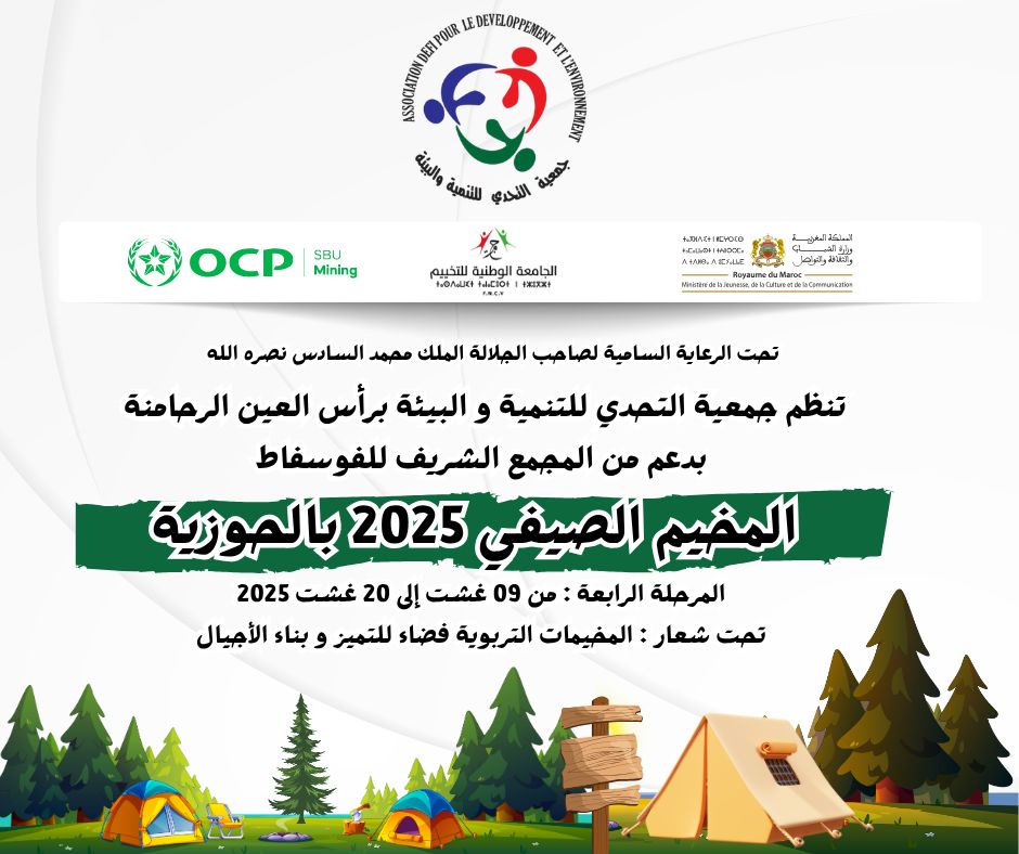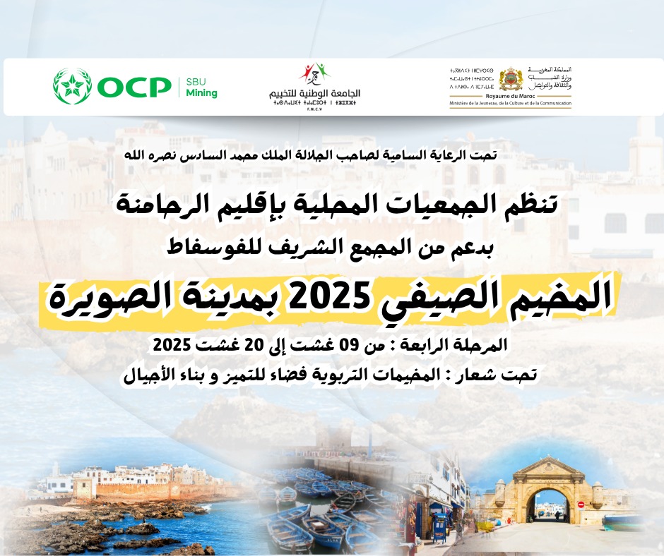 تحت الرعاية السامية لصاحب الجلالة الملك محمد السادس، وبدعم من المجمع الشريف للفوسفاط (OCP)، أطلقت الجمعيات المحلية بإقليم الرحامنة فعاليات المخيمات الصيفية لعام 2025. يندرج هذا النشاط ضمن المرحلة الرابعة من البرنامج الوطني للتخييم، ويشمل تنظيم مخيمين هامين: الأول بمدينة الصويرة، والآخر بمنطقة الحوزية.