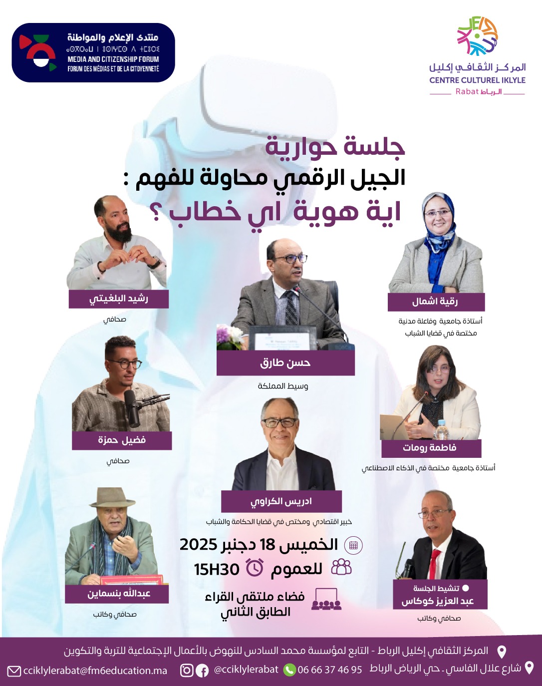 الرباط، 17 دجنبر 2025 – في إطار برامجه التفاعلية، ينظم منتدى الإعلام والمواطنة جلسة نقاشية حول موضوع “الجيل الرقمي، محاولة للفهم – أيّ هوية وأيّ خطاب؟”، وذلك يوم الأربعاء 18 دجنبر 2025 بالمكتبة الوسائطية لمؤسسة محمد السادس للنهوض بالأعمال الاجتماعية للتربية والتعليم، ابتداءً من الساعة الرابعة مساءً.