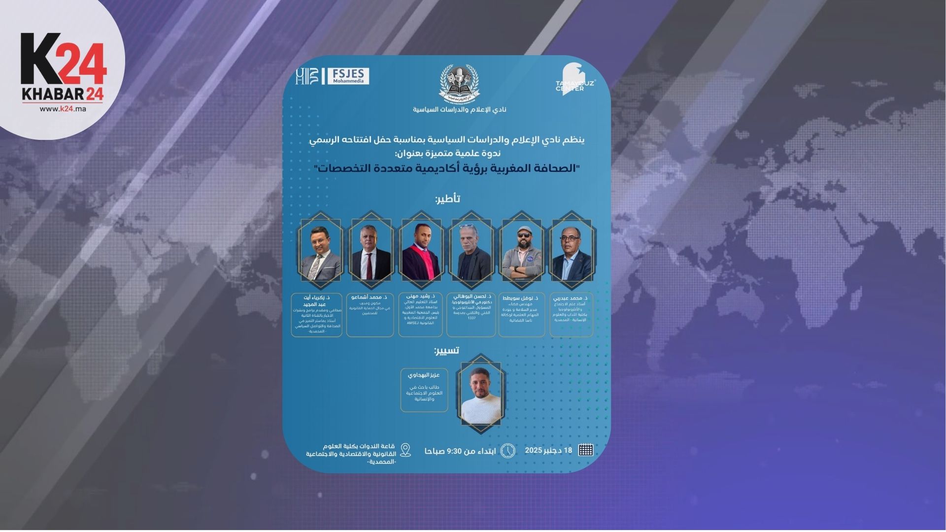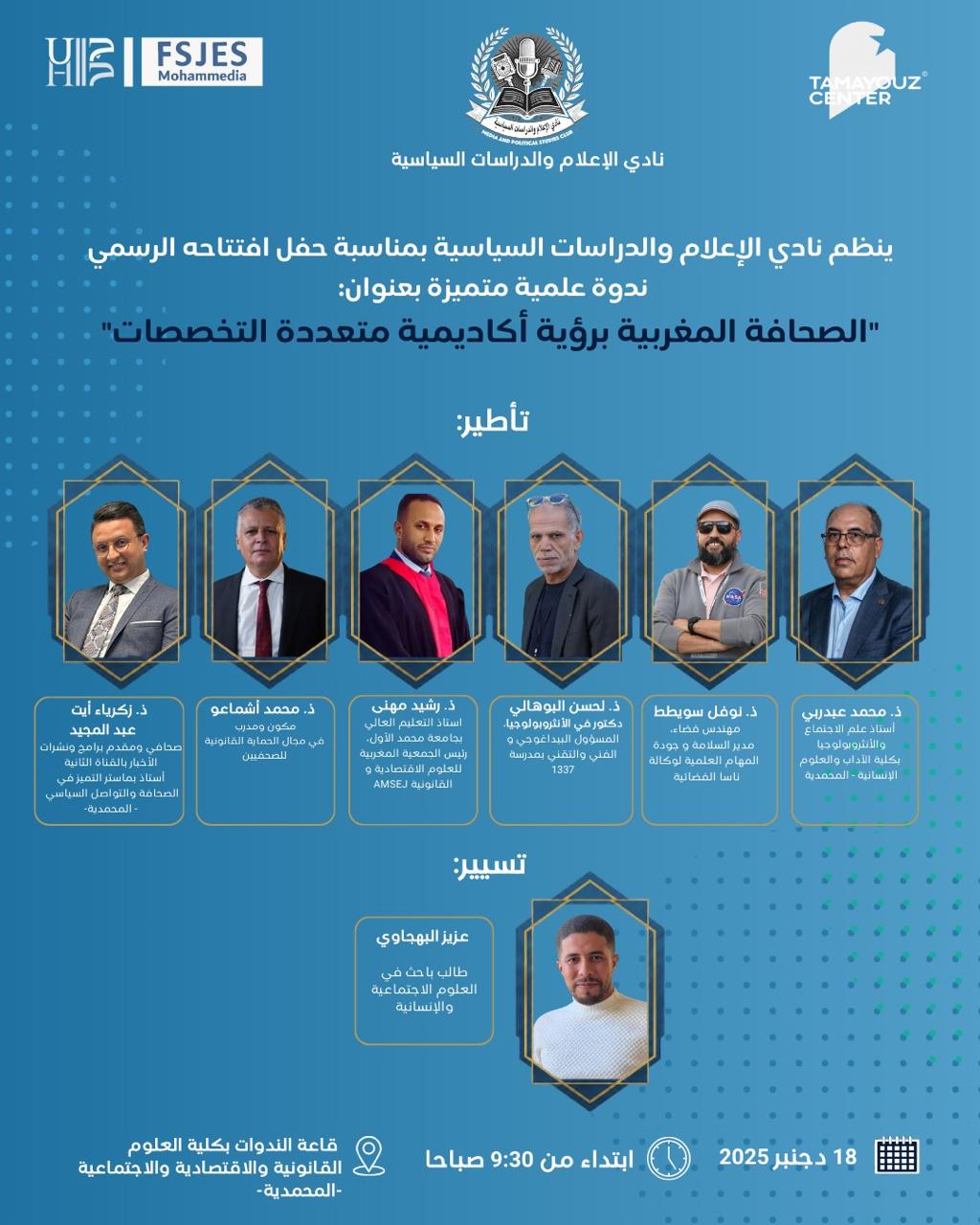 وسيشارك في هذا اللقاء العلمي نخبة من الأساتذة الجامعيين والخبراء والإعلاميين، من بينهم الدكتور نوفل سويطط، مهندس الفضاء ومدير الجودة بوكالة “ناسا” الأمريكية، إلى جانب كل من الدكتور محمد عبد ربي، المتخصص في علم الاجتماع والأنثروبولوجيا، وزكرياء آيت عبد المجيد، الإعلامي بالقناة الثانية (2M) وأستاذ الصحافة، والدكتور رشيد مهني، رئيس الجمعية المغربية للعلوم الاقتصادية والقانونية، فضلاً عن الدكتور محمد أشماعو، الخبير في الحماية القانونية للصحفيين، والدكتور لحسن البوهالي، المتخصص في الأنثروبولوجيا والمسؤول بمدرسة 1337.