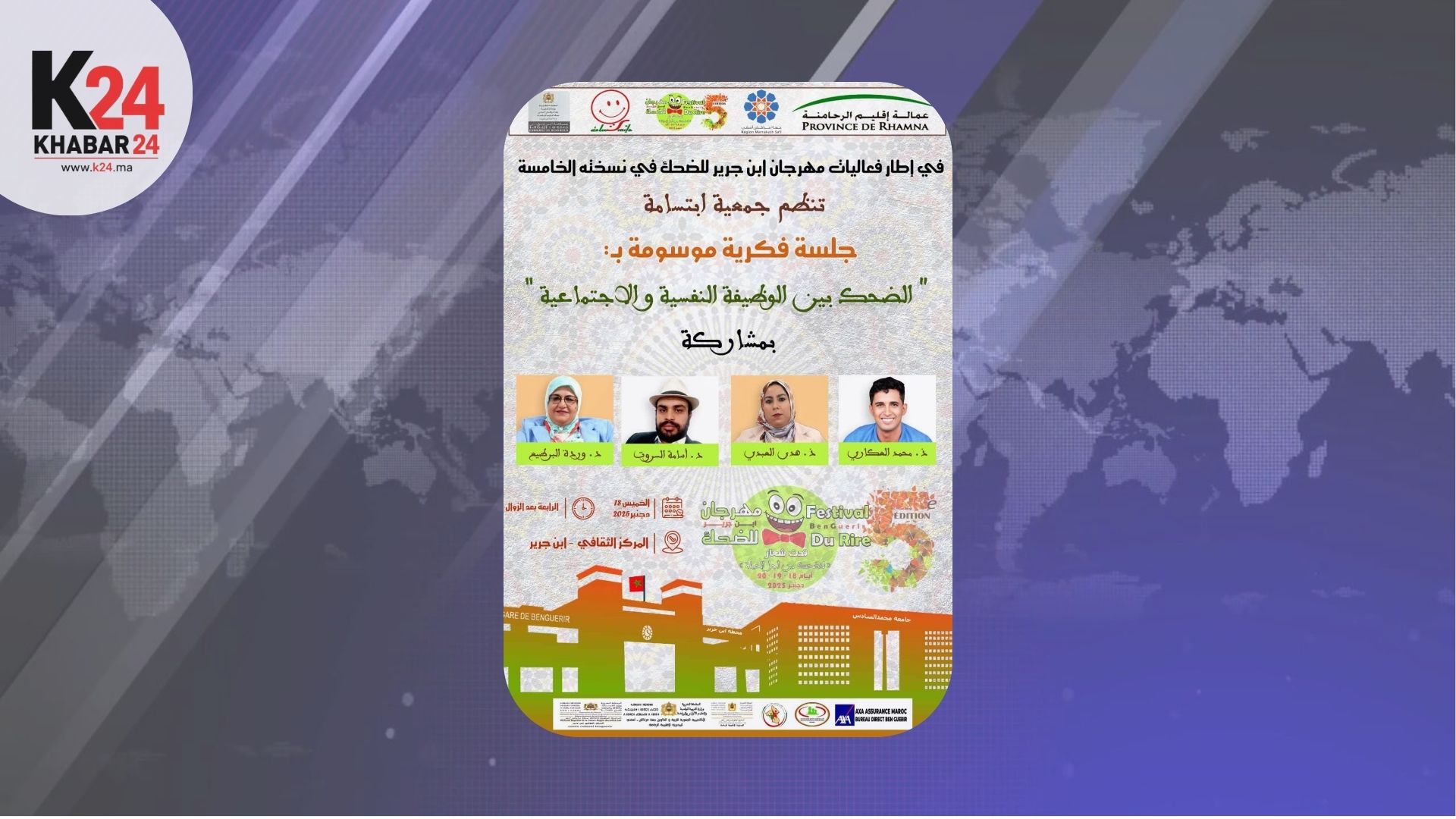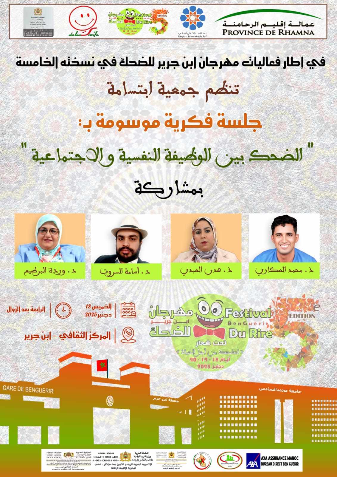 تحتضن مدينة ابن جرير، في إطار فعاليات النسخة الخامسة من مهرجان ابن جرير للضحك، الذي تنظمه جمعية ابتسامة تحت شعار «لنضحك من أجل الحياة»، جلسة فكرية هامة تحت عنوان «الضحك بين الوظيفة النفسية والاجتماعية»، وذلك يوم الخميس 18 دجنبر 2025، ابتداءً من الساعة الرابعة بعد الزوال، بالمركز الثقافي للمدينة.