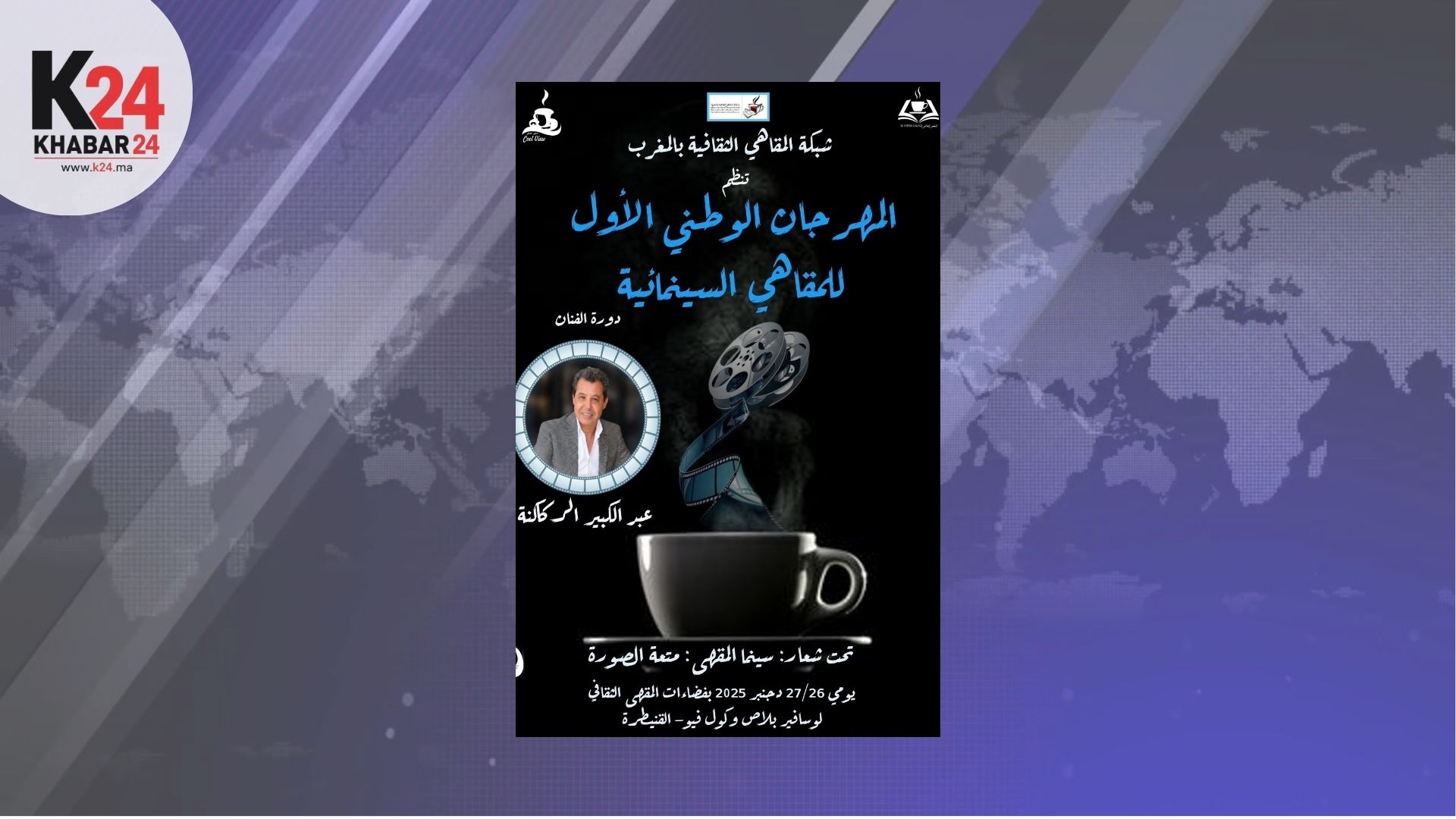 ستنظم شبكة المقاهي الثقافية بالمغرب، يومي 26 و27 دجنبر 2025 بمدينة القنيطرة، فعاليات المهرجان الوطني الأول للمقاهي السينمائية، في دورة تحمل اسم الفنان والممثل عبد الكبير الركاكنة.